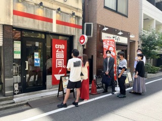 向こうのほうに並んでる人いますね。あれだ!crab台風。さん、めちゃオシャレな店だ。うぉ~、テンション上がってきた!