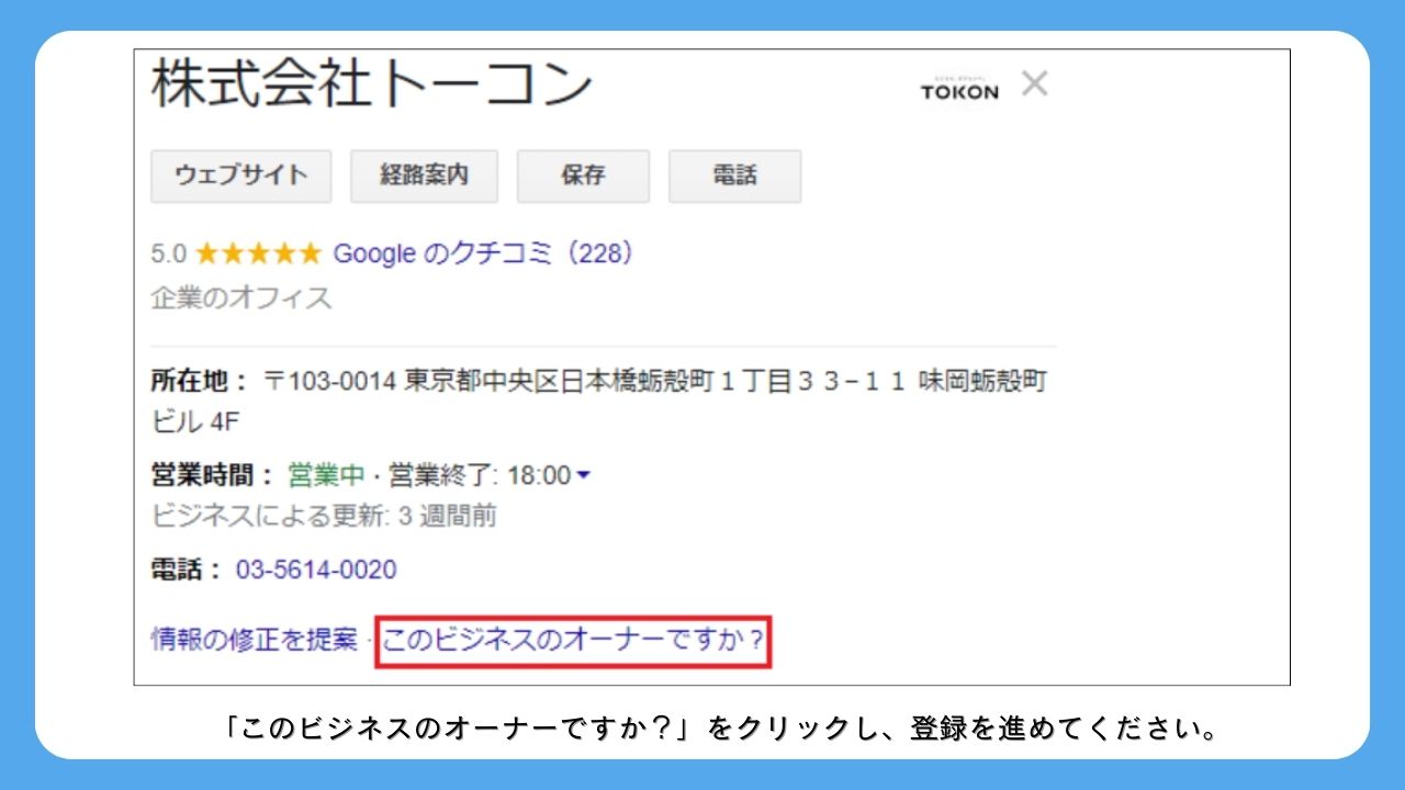 すでにGoogleマップに店舗情報が掲載されている場合は、以下の手順でオーナー登録を行います。