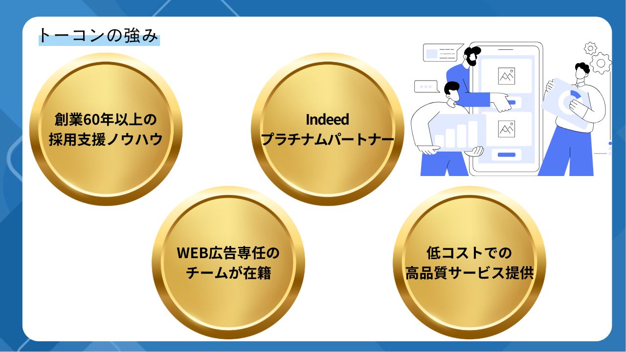 Indeedを運用する代理店は多く存在していますが、その中でもトーコンには絶対に任せてほしいと言える強みがあります。ここでは、トーコンがIndeed運用代行で選ばれる4つの主な理由を紹介します。