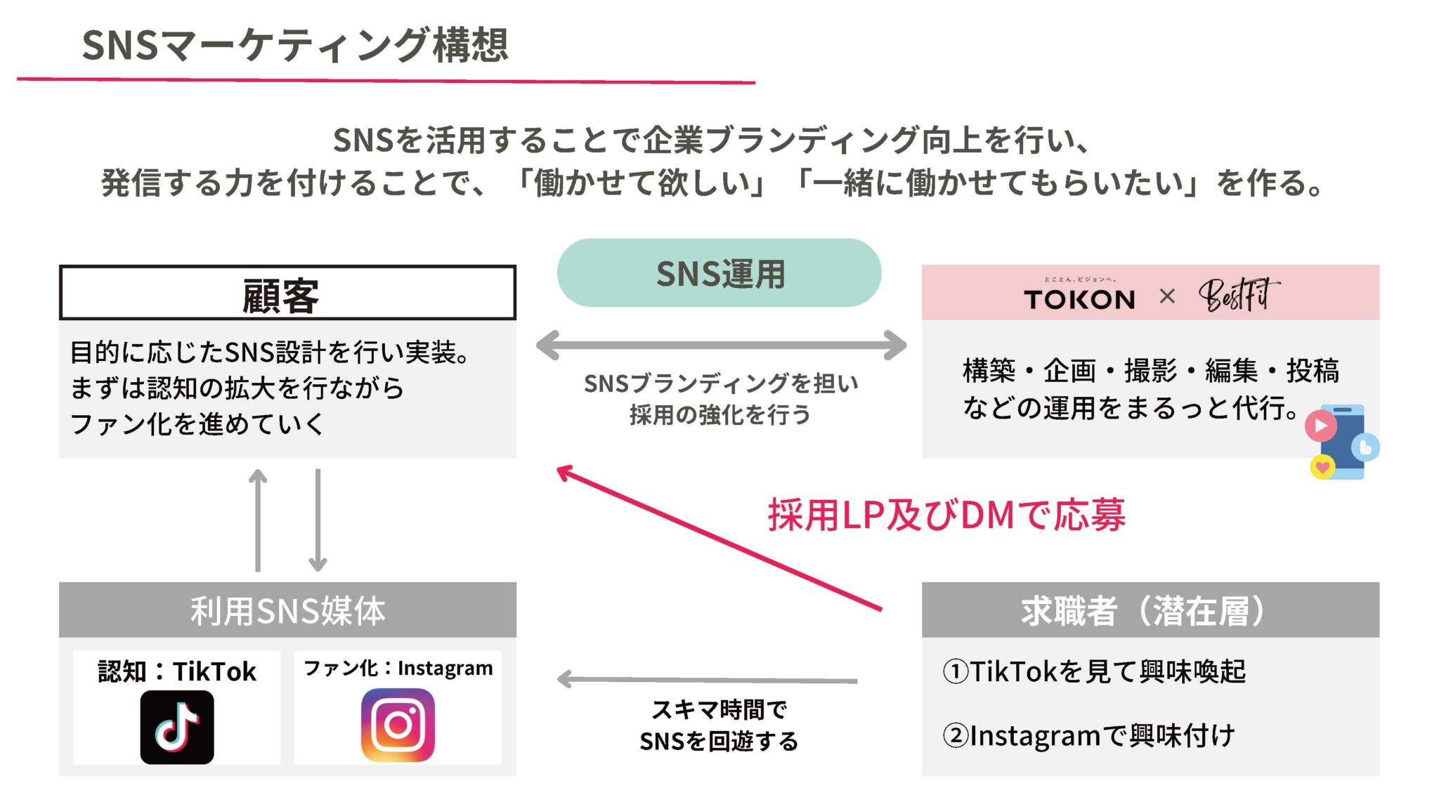 バズリクルートとは、SNSを活用した採用活動をプロが代行するサービスで採用のプロである私たちトーコンと、SNSのプロであるBEST FIT(パートナー企業)が運用を代行いたします。