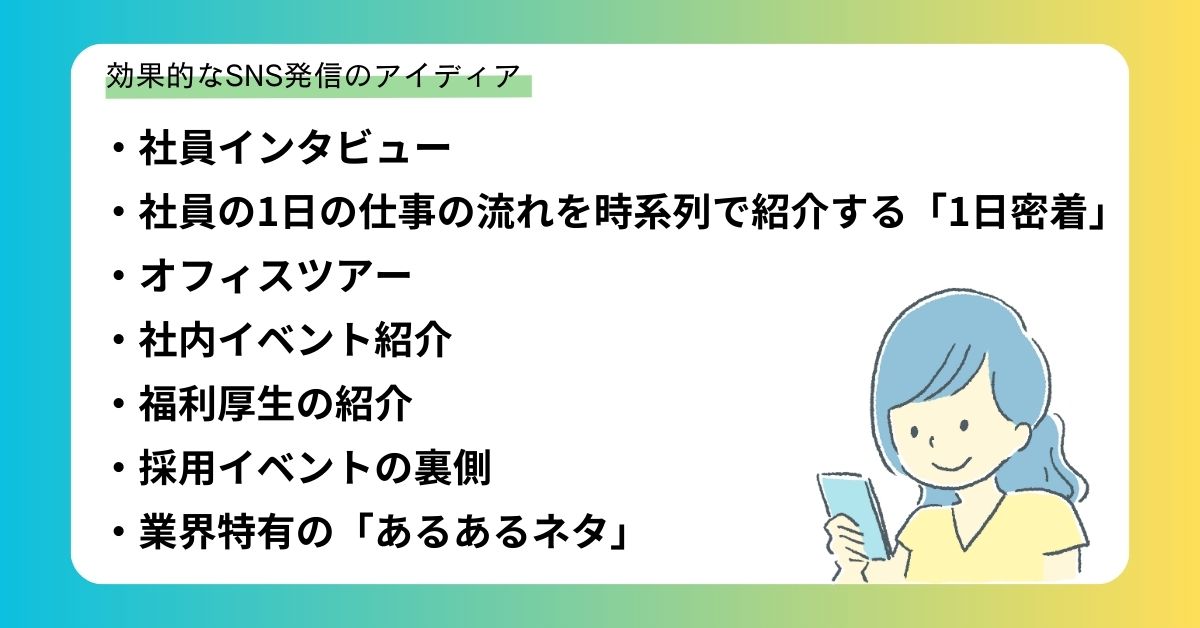 他には、オフィスツアー、社内イベント紹介、採用イベントの裏側、福利厚生の紹介、業界特有の「あるあるネタ」なども有効です。