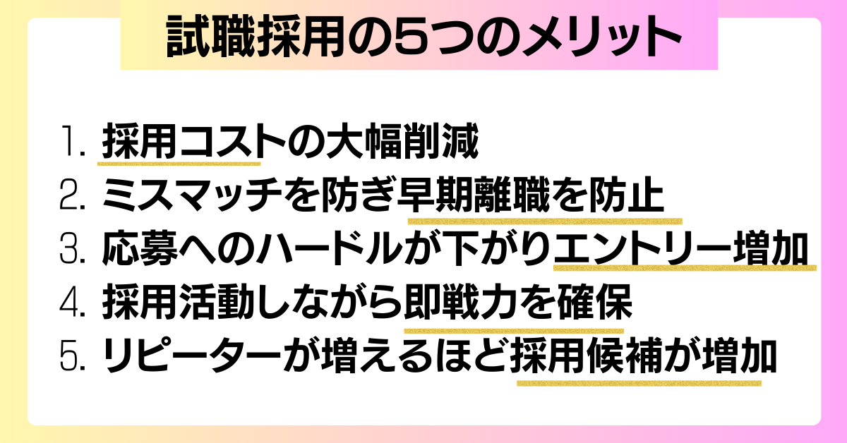 スポットワークを試職採用として活用した場合、企業には採用コストや早期離職の軽減など、5つのメリットがあります。
