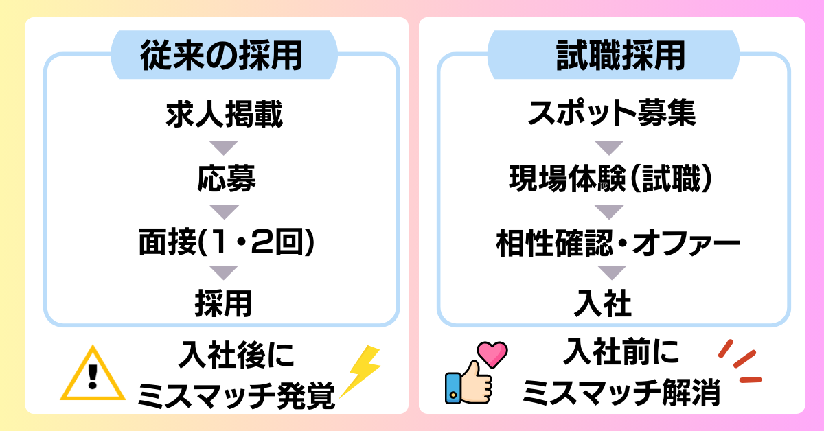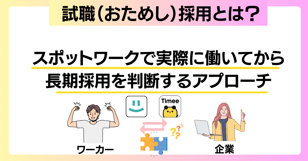試職採用とは、スポットワーク(例:タイミー等)で実際に働いてから長期採用を判断するアプローチです。