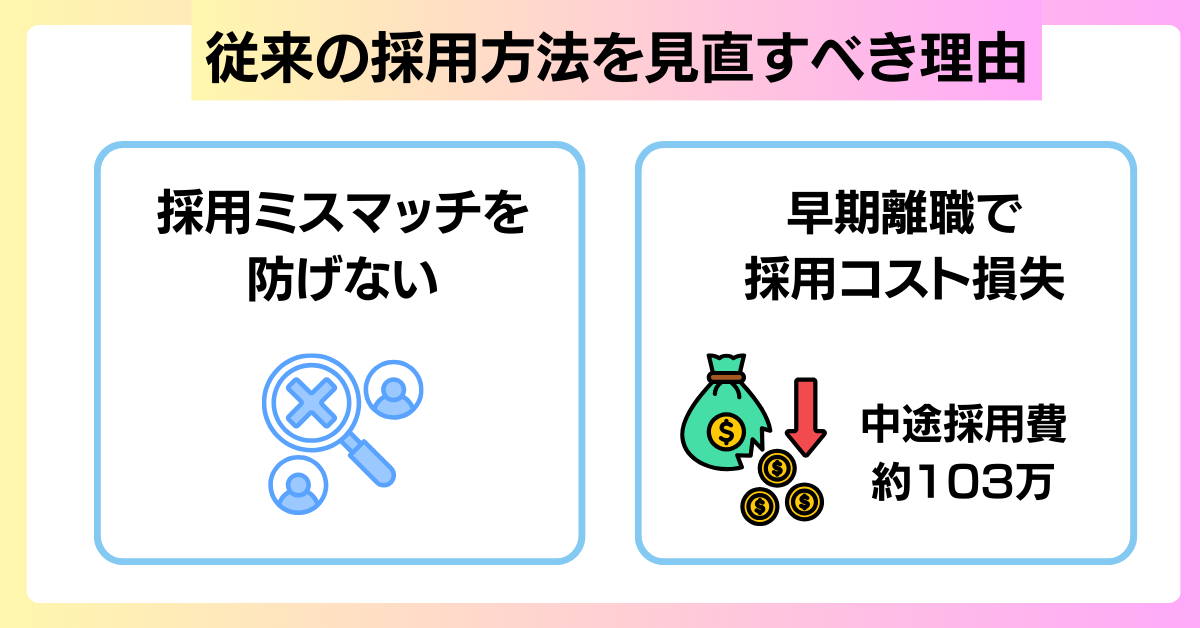 従来の採用方法を継続しても、採用ミスマッチや早期離職を防ぐのは難しいといえるでしょう。